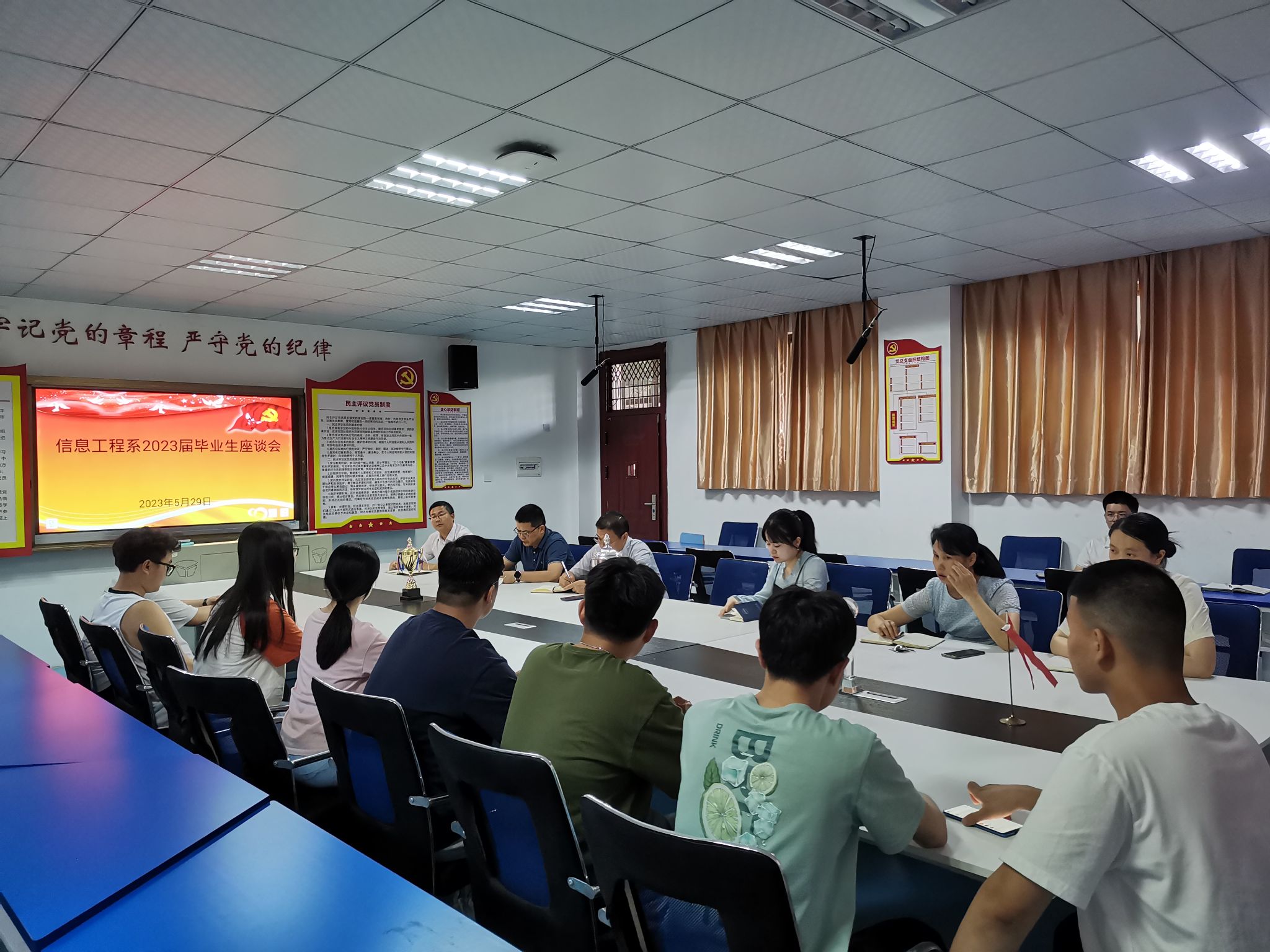 本网讯:为进一步了解2023届毕业生在学习、成长与就业等方面的需求,强化公司服务育人、管理育人、就业育人实效,5月29日下午,信息工程系在明德楼1201会议室召开2023届毕业生代表座谈会。信息工程系主任胡健、党总支书记邓小鸿、副主任康岚兰、学工副主任魏炳辉、信息系教研室代表屈雯、赵秀鸟、彭洁、毕业班班主任陈世琪、辅导员龚峣等教师代表及信息系4个专业的2023届毕业生代表20余人参加座谈会。座谈会由魏炳辉主持。