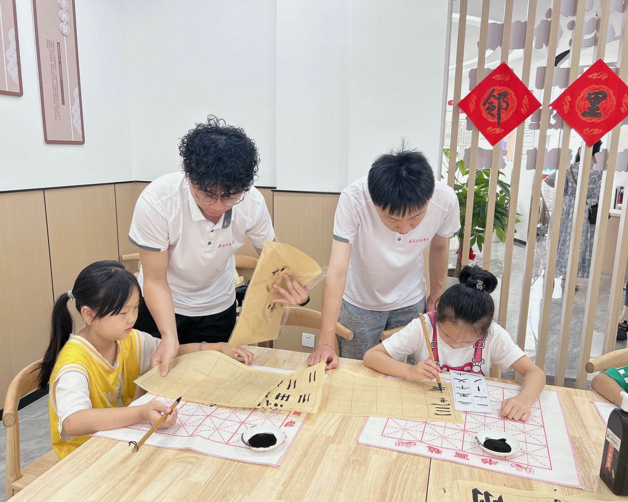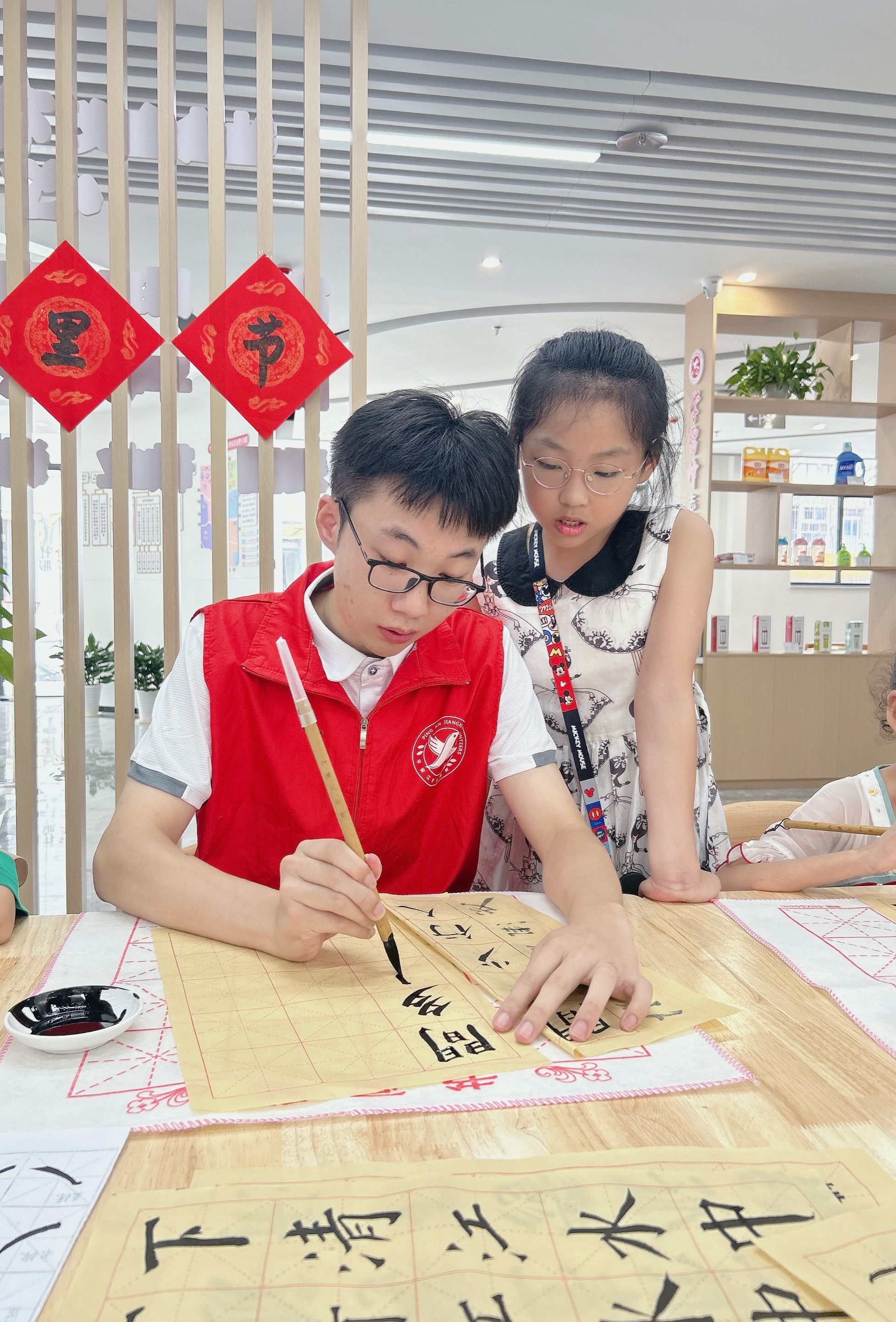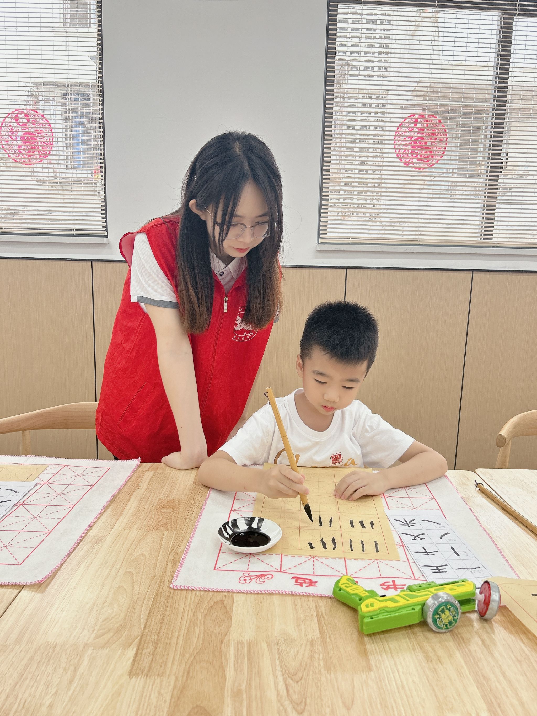 书法课堂上,小朋友们劲头十足,志愿者们耐心细致地讲解书写要点,手把手地指导握笔姿势、书法笔画。一横一竖,一笔一划,小朋友们用心书写每一个汉字,现场墨香浓郁,引领青少年领略中华书法之美,提升艺术审美能力。同时,进一步引导我系员工志愿者在文明实践服务中了解增强时代责任感、提高社会实践工作能力。