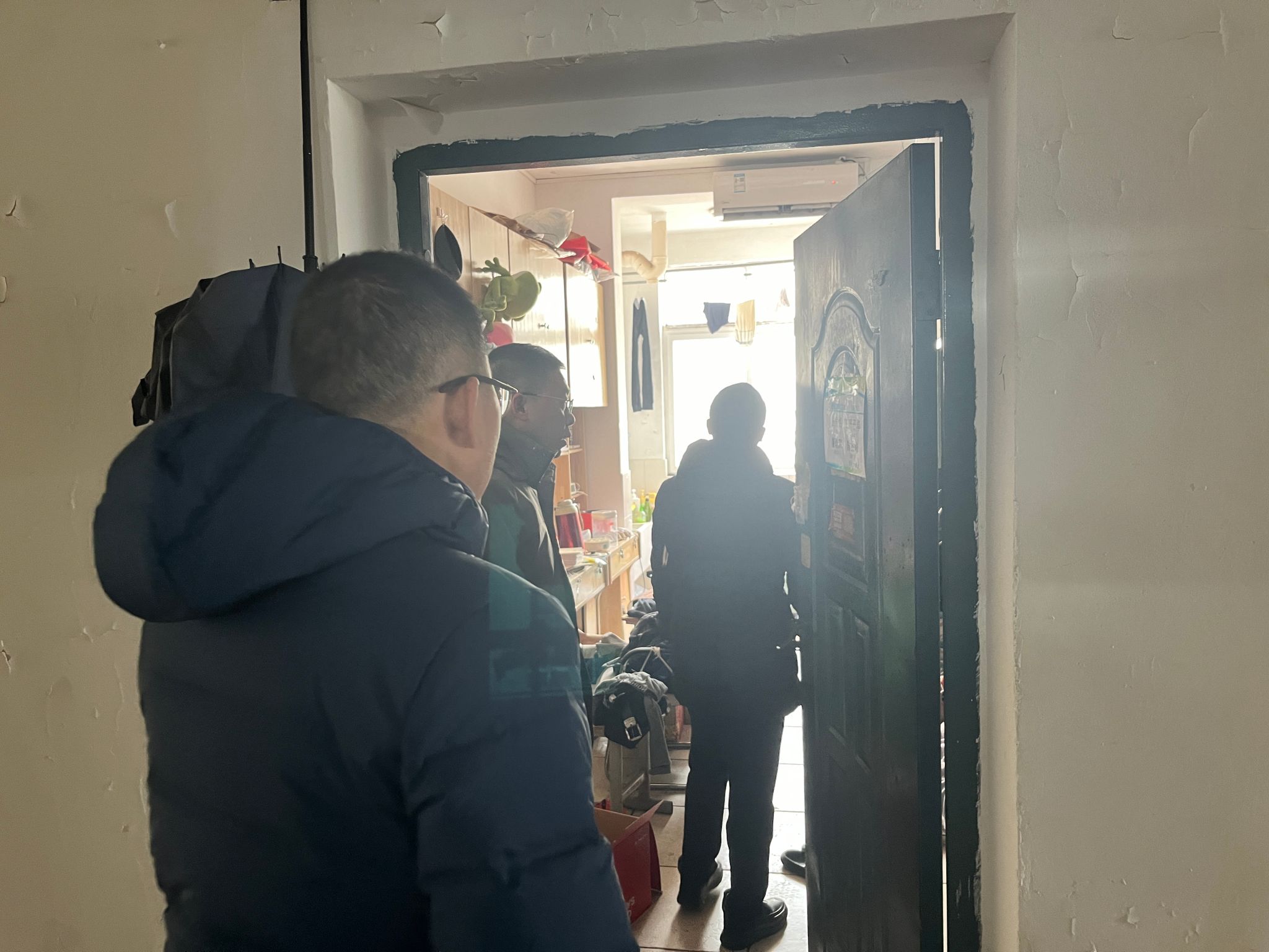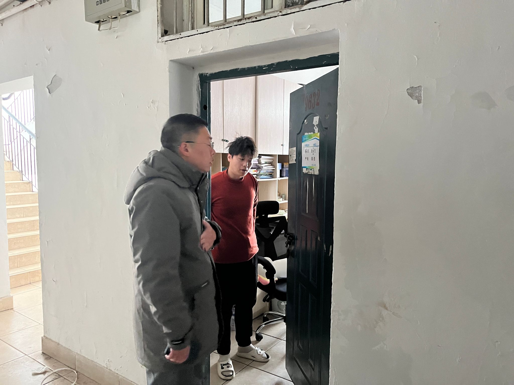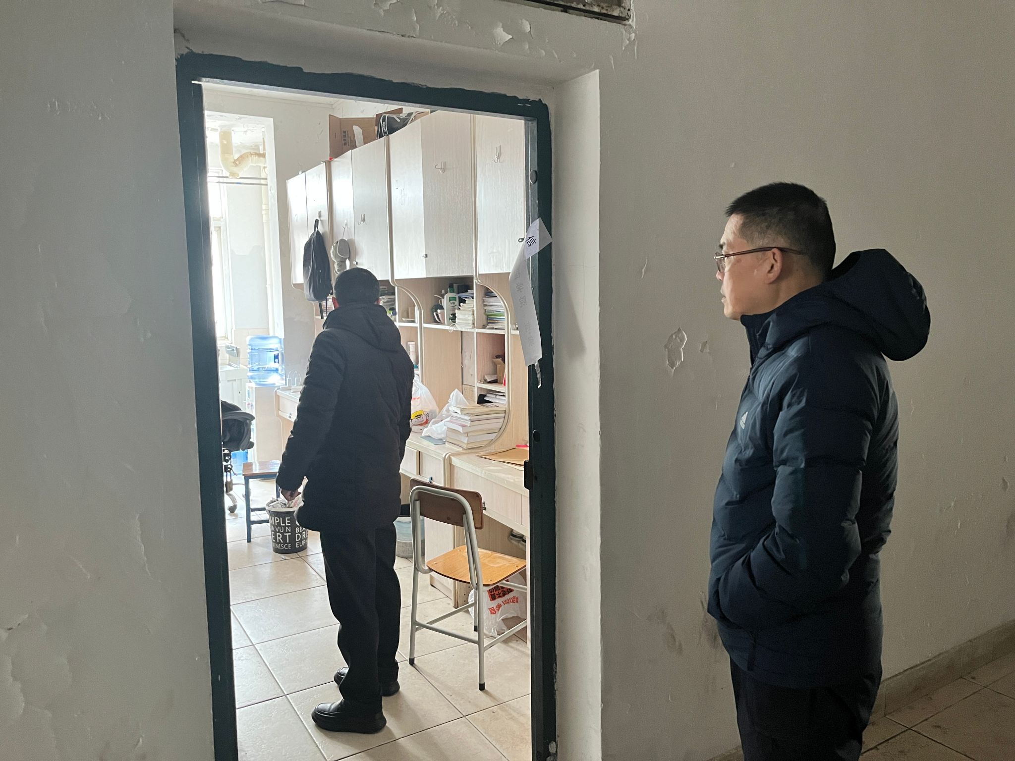 随后,一行人前往员工宿舍,了解暂未离校员工近况,并且叮嘱日常用电安全,之后还逐间检查了员工宿舍的封条情况、宿舍楼的消防设施以及楼道通道的畅通情况。