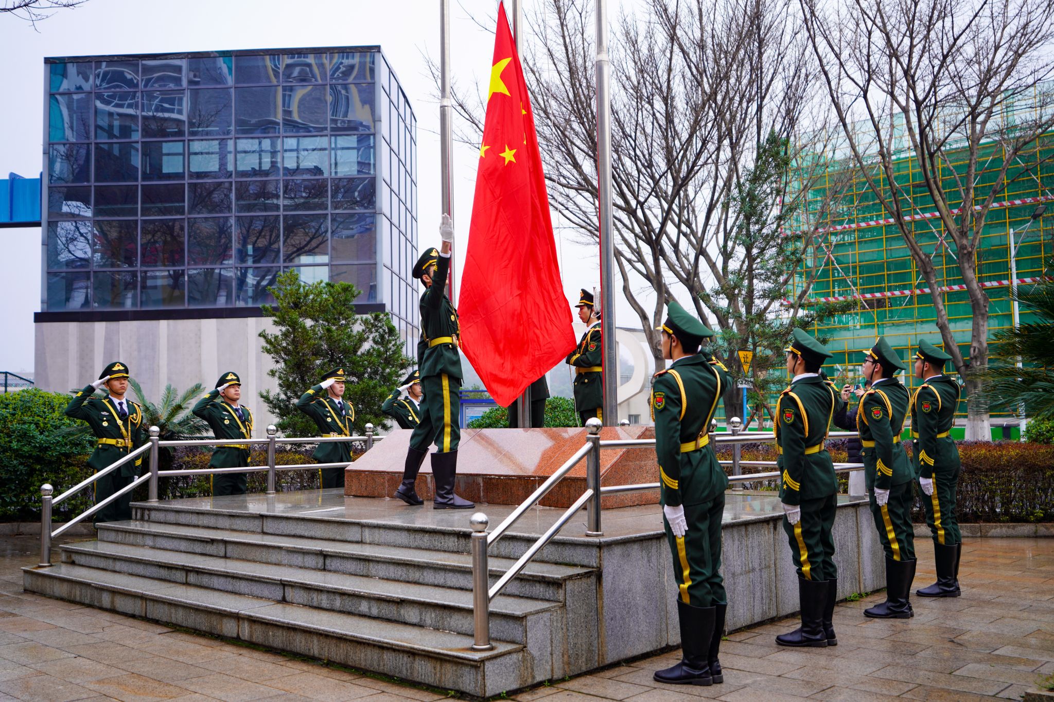 早晨7点30分,公司国旗护卫队的旗手们迈着矫健的步伐,护送着鲜艳的五星红旗入场。伴随着《义勇军进行曲》的响起,五星红旗冉冉升起,全体行注目礼、奏唱国歌,现场氛围庄严。