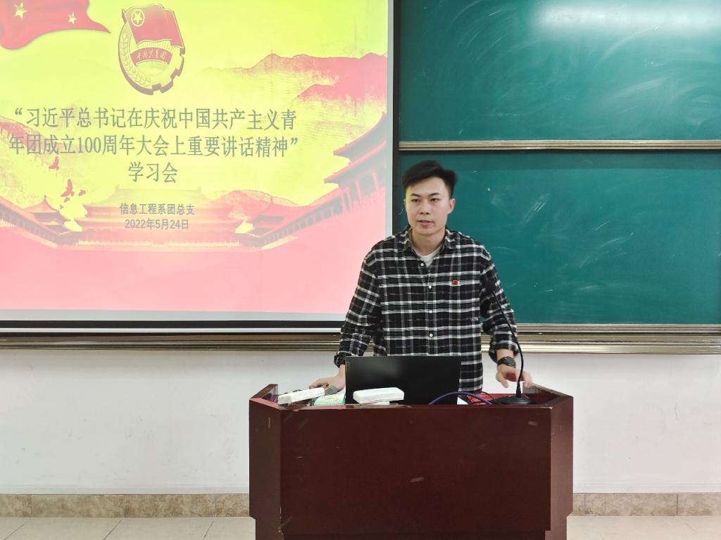 本网讯:2022年5月24日下午三点,信息工程系各班宣传委员在主教Z102开展了关于“习近平总书记在庆祝中国共产主义青年团成立100周年大会上重要讲话精神”学习会。参加此次学习会的还有信息工程系团总支书记陈世琪老师。