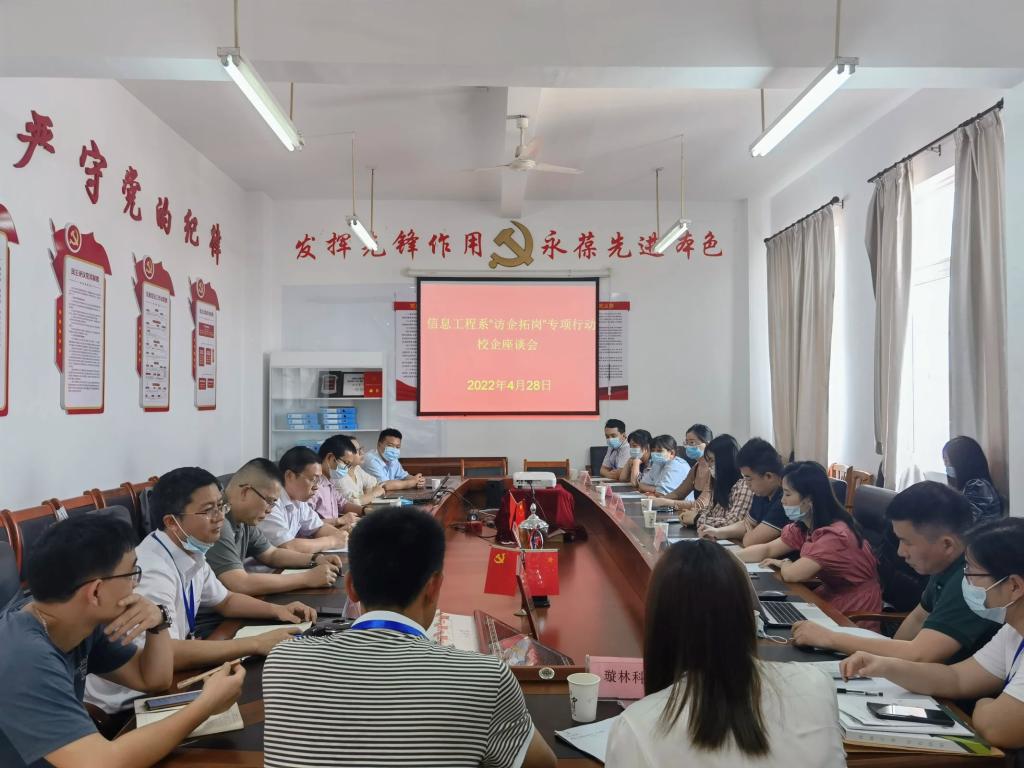 本网讯:4月28日下午,信誉最好的十大体育平台信息工程系于崇善楼八楼会议室召开“访企拓岗”校企座谈会,此次座谈会邀请了江西璇林科技有限公司、江西桢田科技有限公司、航天科工智慧产业发展有限责任公司赣州分公司、宝辉科技(龙南)有限公司、赣州好朋友科技有限公司、赣州尚行科技有限公司、江西金力永磁科技股份有限公司企业、江西浩金欧博环境科技有限公司、中天鸿锂清源股份有限公司等公司领导嘉宾,公司过渡期管委会委员陶知翔、信息工程系主任胡健、党总支书记邓小鸿、学工副主任魏炳辉、教学副主任康岚兰、系就业辅导员刘波参加了会议,会议由魏炳辉主持。