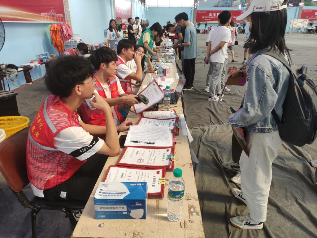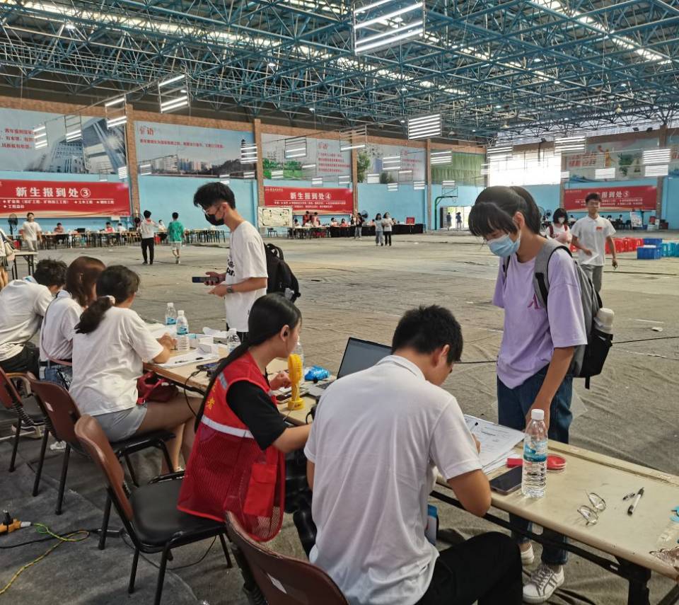 上午7点,风雨操场及其它迎新接待点的工作已经陆陆续续的开始了,志愿者们在风雨操场门口帮助学弟学妹们拿行李,协助新生们完成报名环节的每一步并协助新生入住员工宿舍。志愿者们乐于助人,耐心帮助新生们,即使顶着大太阳也热情满满,志愿服务的每一个环节都让新生们深切地感受到我们志愿者们对新生们的照顾。下午,此次迎新工作已经接近尾声,但是在每一个站点还是可以看见身披红色马甲的志愿者们,他们在等待着最后的几位学弟学妹们,帮助他们报到,让每一个人新生都能更好与班级这个大家庭会合。