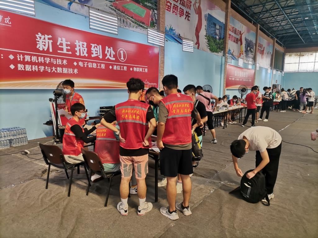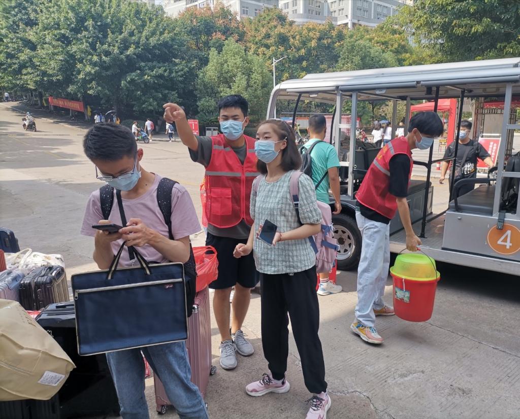 2021年9月14日,信息工程系迎新志愿者开始前往赣州市汽车南站及赣州市汽车总站迎接新生,并于风雨操场为新生办理报到手续。汽车站接待点,每一趟车一到站,新生和家长一下车,众多的迎新志愿者立即上前迎接礼貌问候,并帮助新生和家长提着沉重的行李。风雨操场中,各志愿者井然有序地带领新生办理入学手续,并不厌其烦地为新生、家长回答他们提出的各种问题。不少志愿者主动帮忙拎行李,帮助新生入住宿舍。新生细声地叫着学长学姐,老生们也热心地为他们介绍公司环境及学习生活中的各种注意事项。人头攒动,秩序井然。