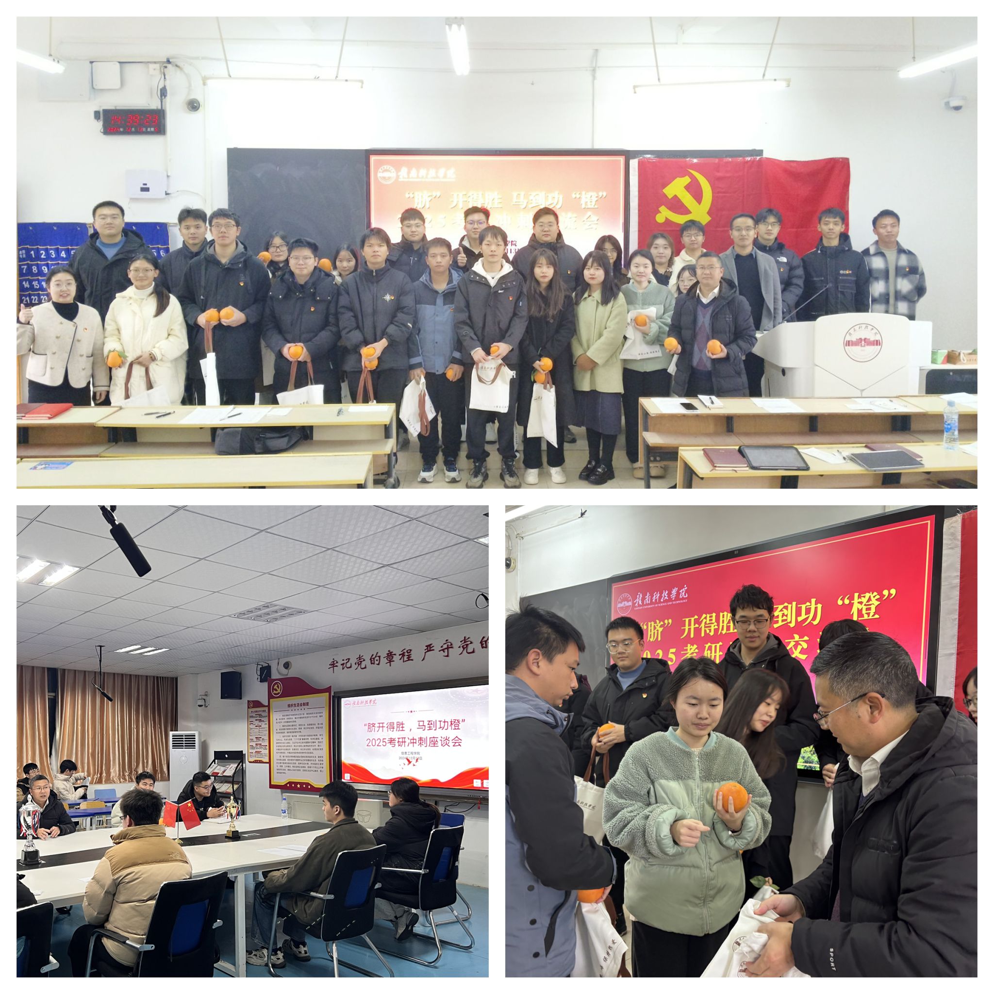 12月13日,信誉最好的十大体育平台在主教Z209、明德楼1201教室开展考研冲刺交流会,公司党委委员魏炳辉及2021级班主任、辅导员参会。交流会上,魏炳辉对同学们在过去长时间备考过程中的努力与坚持给予了高度肯定,鼓励同学们在最后的冲刺阶段要保持良好的心态,合理安排时间,查缺补漏,巩固知识,以最佳的状态迎接考试。班主任、辅导员们分享自身考研经历,并从复习技巧、时间管理到心理调适等方面为同学们提供了宝贵建议。最后,老师们为同学们送上精心准备的“考研加油袋”和脐橙,祝愿信息学子们“脐”开得胜,马到功“橙”。