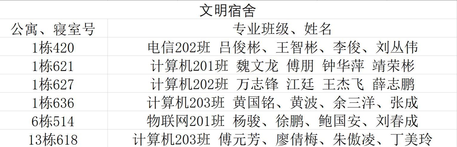 本网讯:为使员工有一个整洁、安静、和谐的学习和生活空间,同时营造良好的学习生活环境。经员工个人申请、班级评议、系部初审,信息工程系结合实际情况评选出以下文明宿舍。