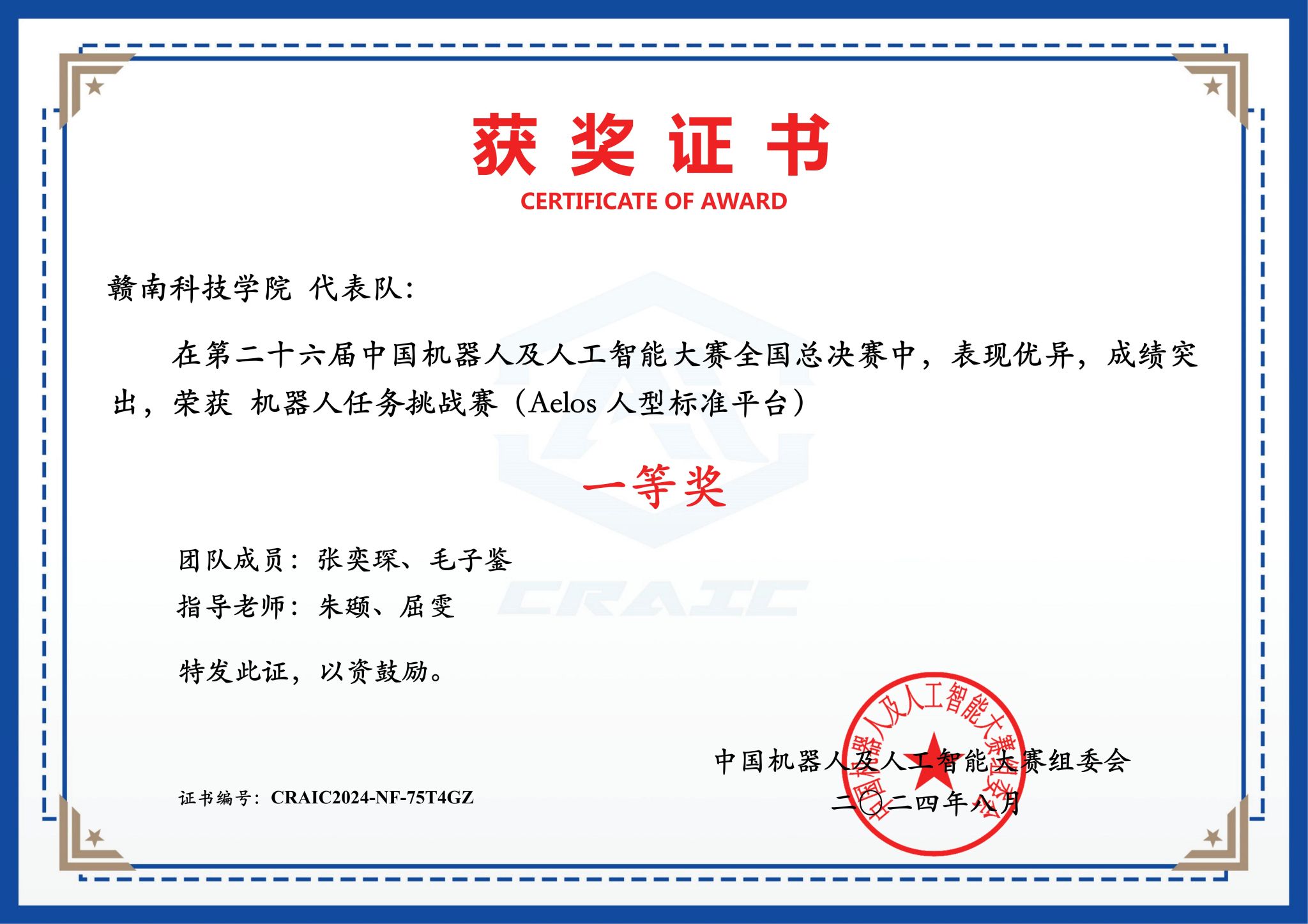 据悉,中国机器人及人工智能大赛是教育部列为本科教学评估的国家A类竞赛,此次大赛聚焦人形机器人、自动驾驶、无人机等热点技术,开展了11个项目的比赛。公司两支队伍认真准备机器人任务挑战赛(Aelos人型标准平台)项目,历经六月份省赛,七月份国赛线上赛,最终在八月份的线下赛中脱颖而出,凭借扎实的专业基础和默契的团队协作,勇夺“国家一等奖”2项。