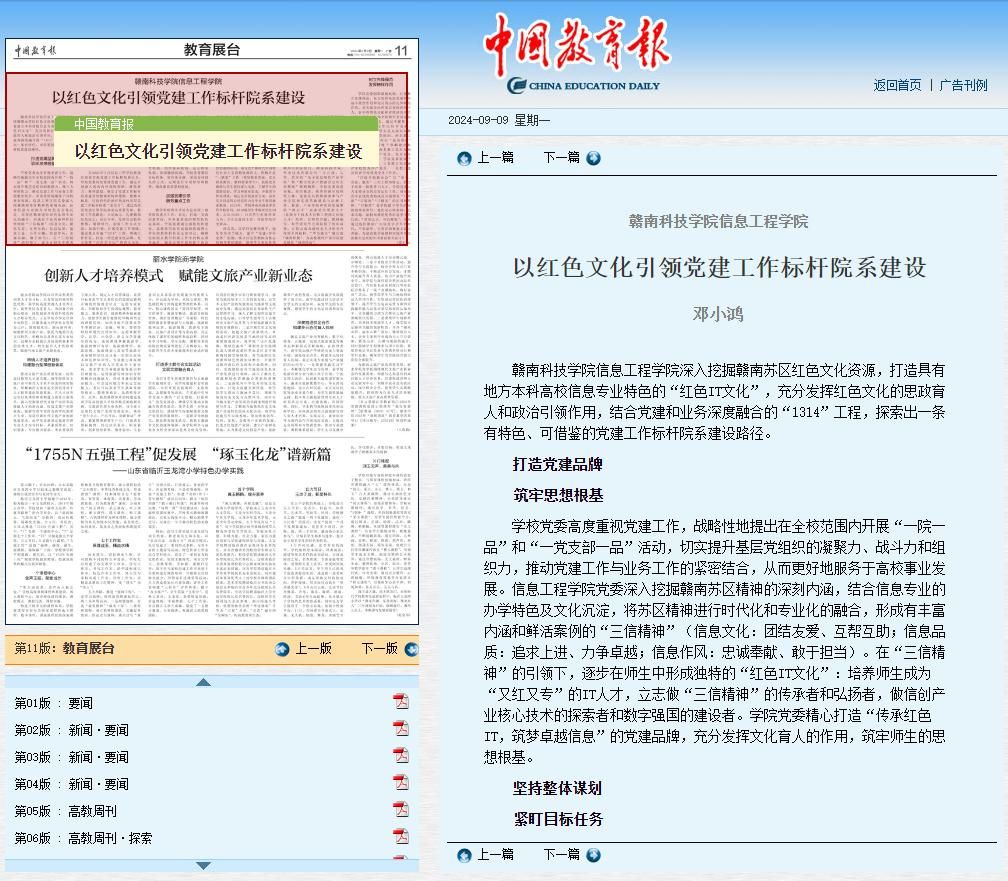 本网讯:9月9日,《中国教育报》第11版“教育展台”栏目刊发了公司公司党委副书记邓小鸿题为《以红色文化引领党建工作标杆院系建设》的文章,对公司党建工作标杆院系建设做法进行总结介绍。文章链接:http://paper.jyb.cn/zgjyb/html/2024-09/09/content_144750_17792676.htm。