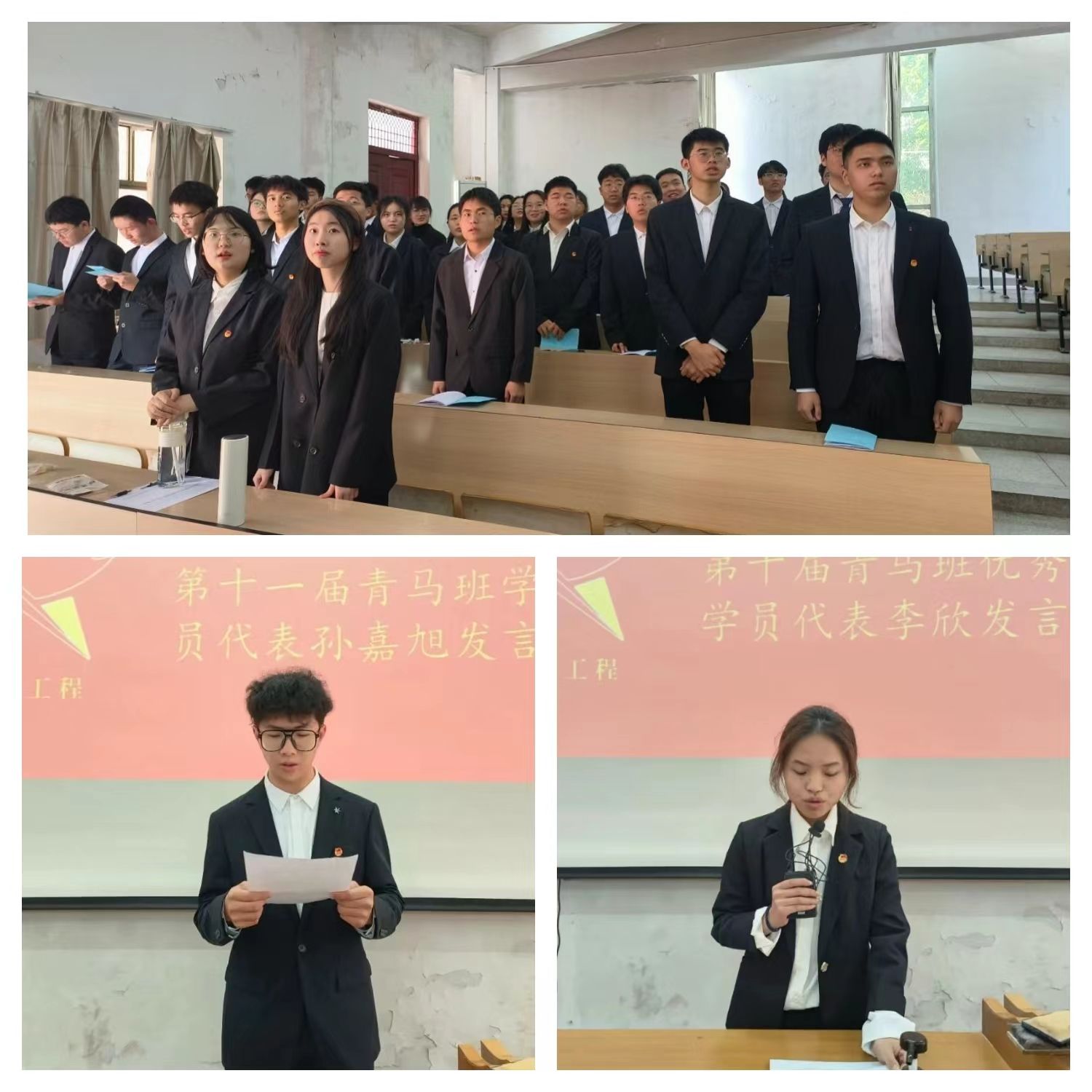 仪式开始,首先由优秀学员代表大数据212班李欣同学发言,她向我们解释“纸上得来终觉浅,绝知此事要躬行”的道理,让我们知道实践的意义。再而由通信221班孙嘉旭同学向我们阐述了开设“青马工程”的意义所在及我们老员工的职责所在,并代表全体学员郑重承诺——严格遵守“青马班”各项规章及考核制度。让我们更加了解青马工程。