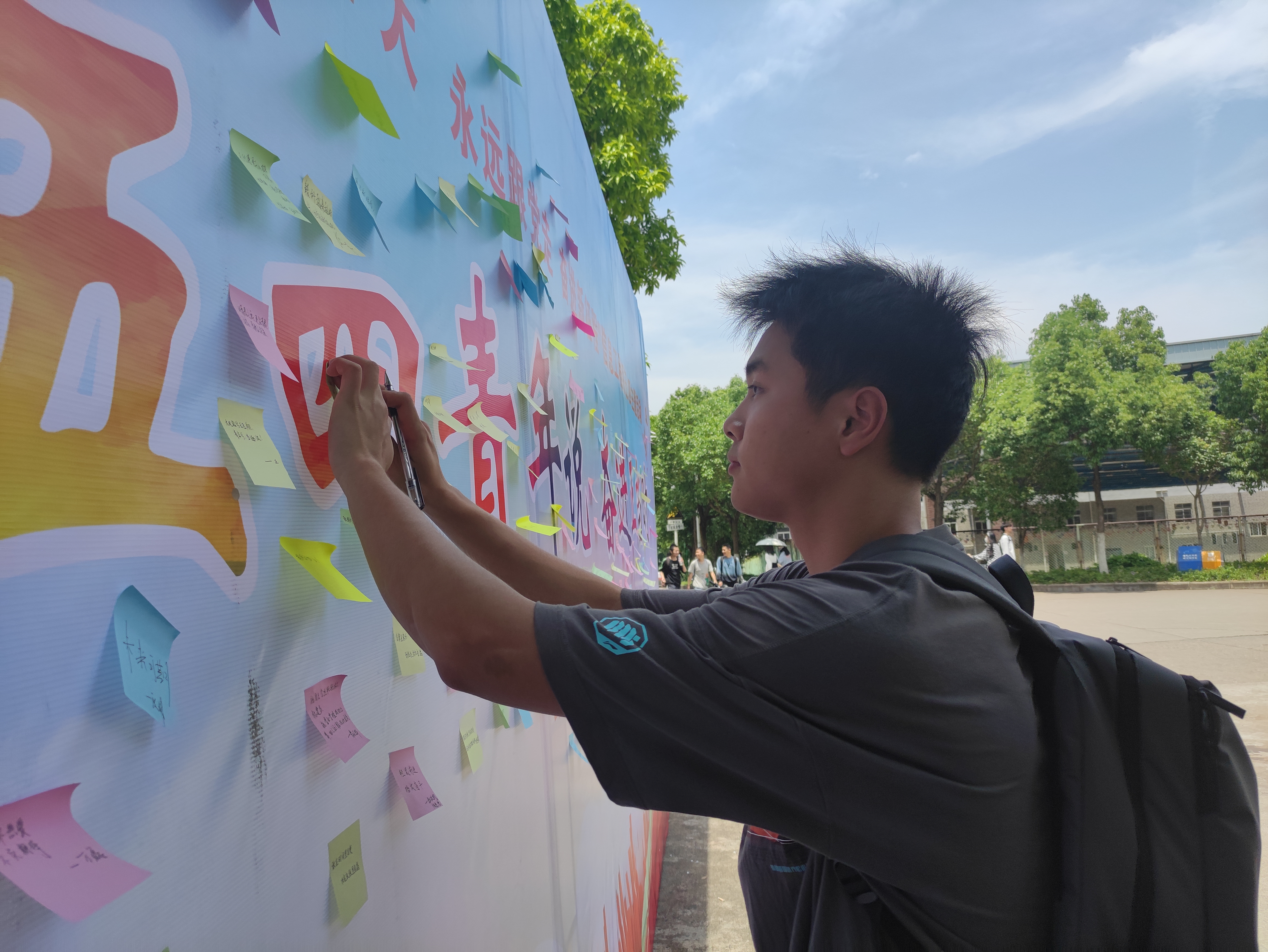 同时,在公司图案书馆前设置签名墙、合影墙,让每一位路过的同学都可以拿起画笔填充图片墙,留下写上自己祝福的便利贴。“青年说”板块中,信息青年纷纷利用下课的空闲时间,相约来到留言墙前领取便签,于身自省,思考自己的青春命题,以文字的形式记录下独特的青春感言,将写有青春感悟的便签贴在留言墙上,将文字汇集成一面美丽的青春之幕。并在“拍照墙”前与好友留下影像,展现青春风采,喜迎五四。
