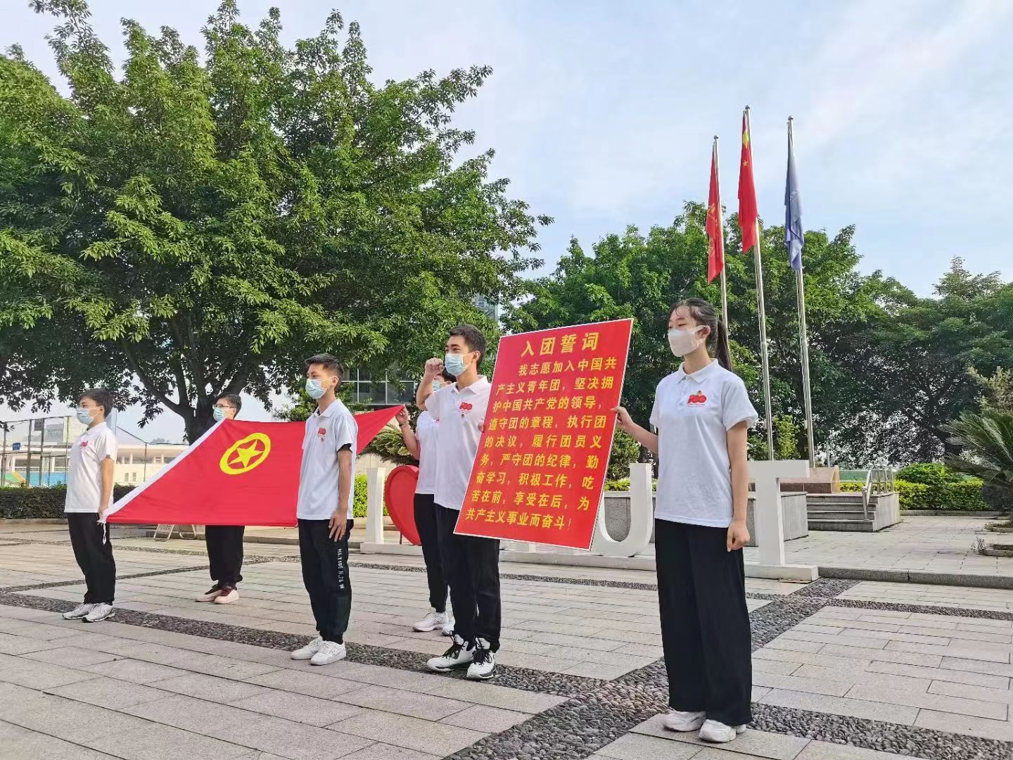 升国旗仪式后,员工代表王称荣在国旗下作了“喜迎二十大 永远跟党走 奋进新征程”主题演讲。随后,信息工程系学子面对着鲜艳的团旗,紧握右拳,重温入团誓词,许下了庄严的青春誓言。最后,全体同学手握小红旗,齐声高唱《歌唱祖国》,随风舞动的红旗,嘹亮的歌声表达着团员青年对祖国美好未来的憧憬和祝福。