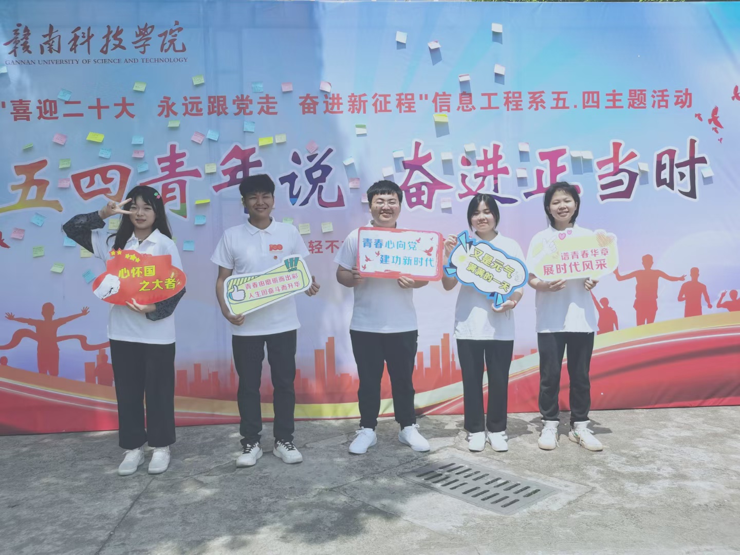 本网讯:为迎接党的二十大召开、庆祝中国共产主义青年团成立100周年、纪念五四运动103周年,引导广大团员青年增强永远跟党走的信念和决心,激励和引领全体同学大力弘扬“爱国、进步、民主、科学”的五四精神,厚植爱党、爱国、爱社会主义的思想情感,信息工程系举行“喜迎二十大、永远跟党走、奋进新征程”五四主题团日活动。活动由升国旗、国旗下演讲、重温入团誓词、合唱《歌唱祖国》、便签留言、青春风采照等活动形式组成。