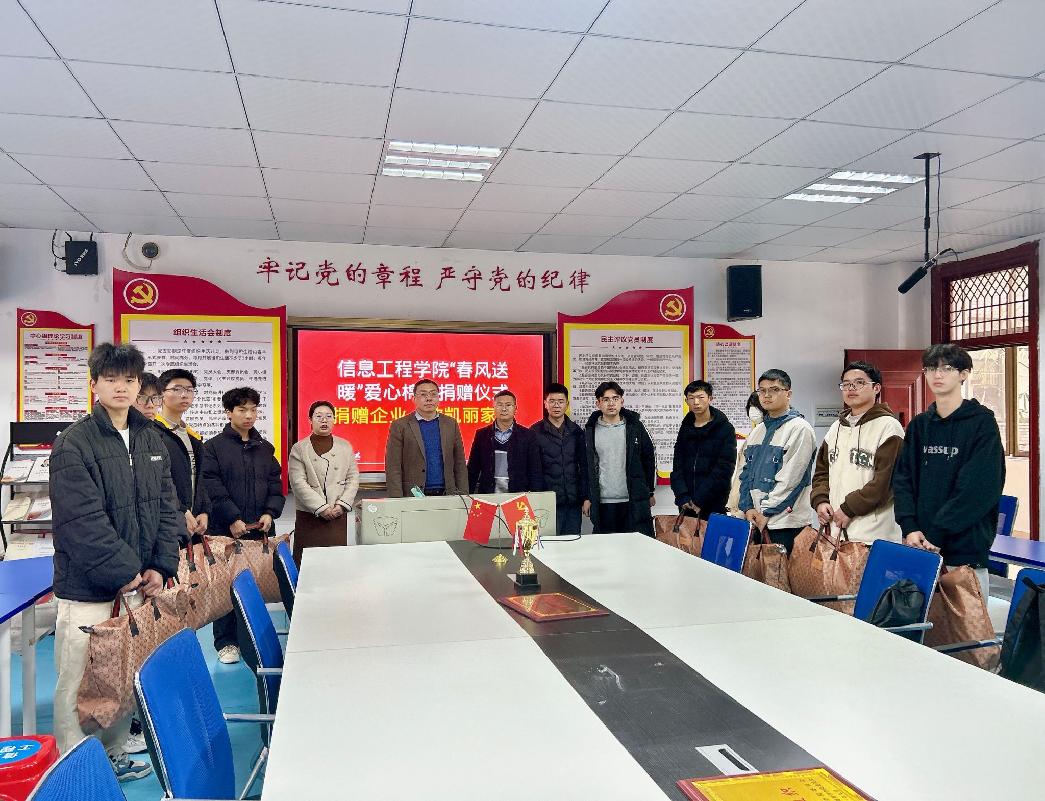 信息工程系党总支书记邓小鸿、学工副主任魏炳辉及受助员工辅导员共同为张甜甜等十名受助员工发放由爱心企业欧凯丽家纺提供的爱心棉被。邓小鸿鼓励员工们心怀感恩,希望员工们在新学期继续奋发向上,做豁达开朗的奋进者;自信昂扬,做传递爱心、提高本领的践行者;做公司资助政策的宣传者,让更多同学感受到“资助育人”政策的温暖力量。