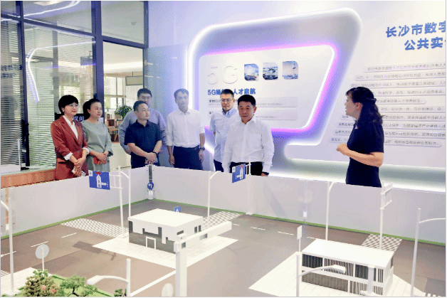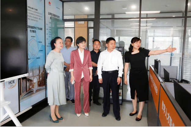 在长沙市数字技能人才公共实训基地董事长赖施颖、华为技术有限公司企业培训认证部南区总监李丹的陪同下,何锦龙一行实地考察了长沙市数字技能人才公共实训基地的展厅、实训室及教学场地等。