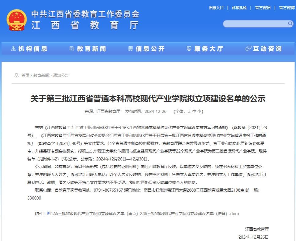 本网讯:12月30日,江西省教育厅、江西省工业和信息化厅联合公布第三批省级现代产业公司建设项目名单,公司电子信息现代产业公司成功入选第三批立项建设重点项目名录,这标志着公司在“产、学、研、用”深度融合、协同发展的又一进步。